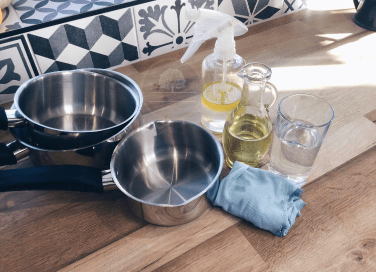 Combine 50g of olive oil, and 6 tablespoons of white vinegar (60G) together and rub them onto the pots, pans and stoves. Let the mixture do its work for around 10 minutes and then remove the excess by washing away.